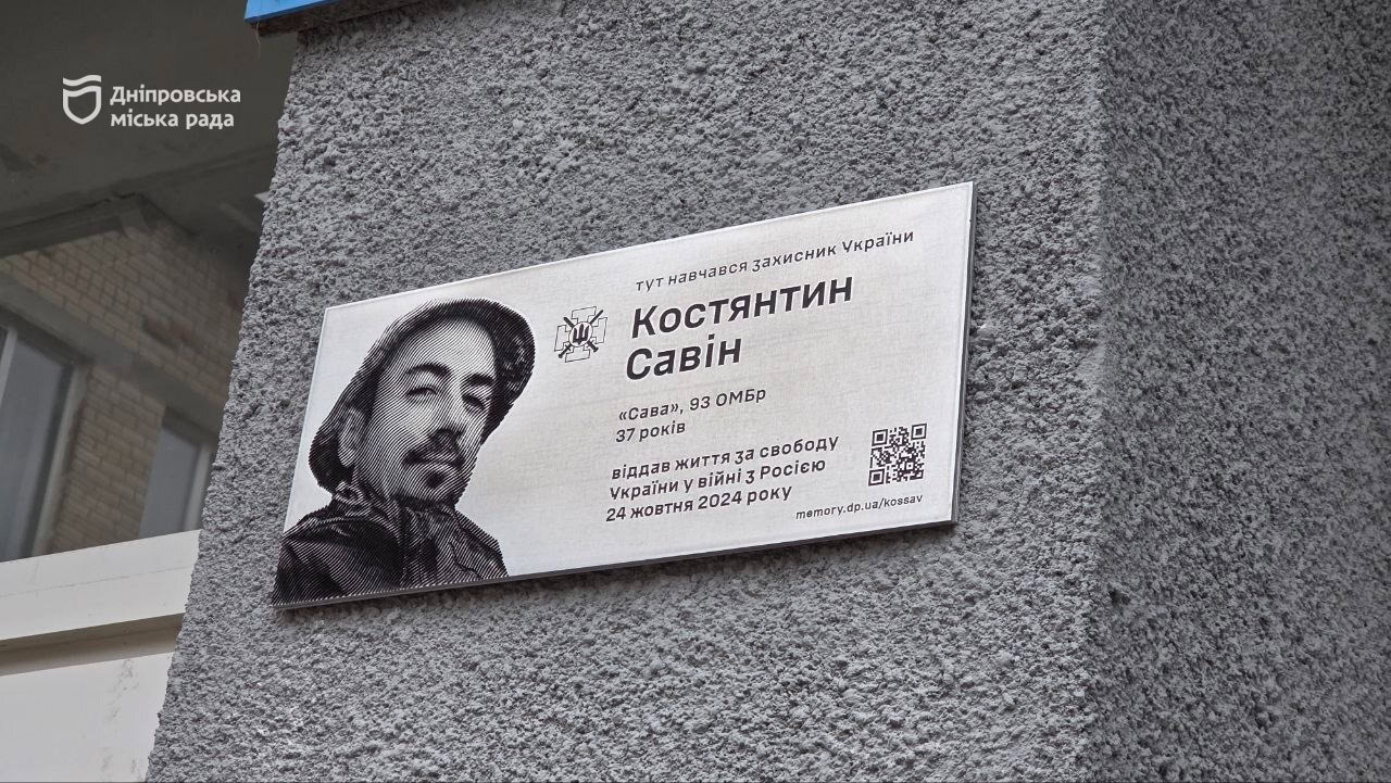 Alina YakovenkoУ Дніпровській гімназії №16 відкрили меморіальну табличку на честь випускника закладу – Костянтина Савіна, позивний Сава. Він народився й виріс у Дніпрі, працював будівельником та виховував дитину. Про це йдеться на сайті міськради Дніпра.