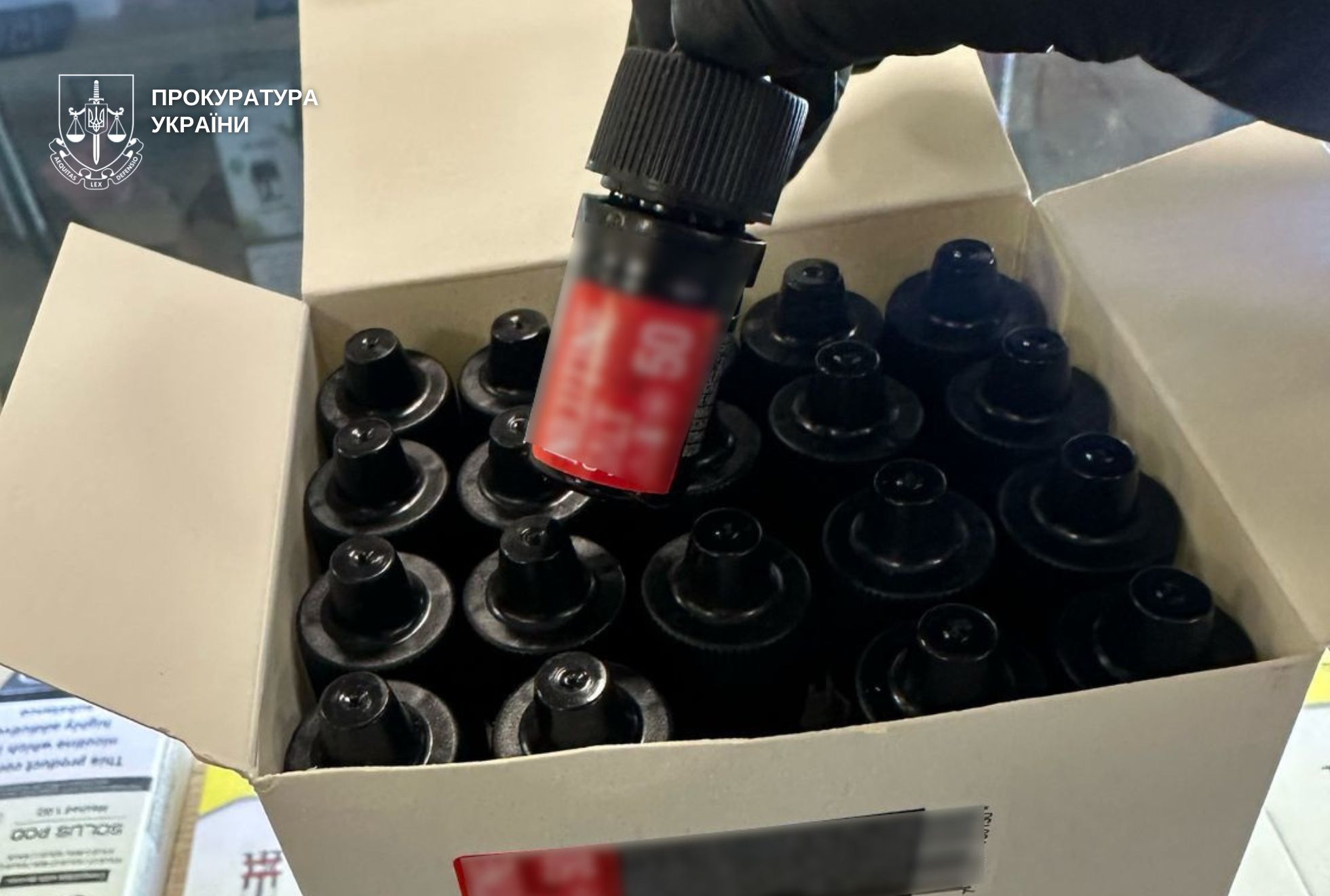 Під час 27 санкціонованих обшуків вилучено виробниче обладнання, техніку для фасування та маркування, понад 100 тисяч ємностей із гліцерином, нікотином та ароматизаторами, а також сотні коробів із тарою, пакуванням та етикетками.