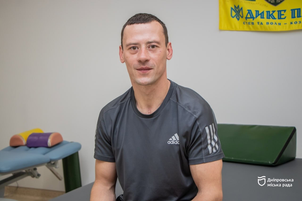 Після евакуації та тривалого лікування чоловік проходить реабілітацію в одному з центрів Дніпра. Фізична терапевтка Поліна розповідає, що він дуже мотивований і наполегливо працює, щодня тренується, вчиться заново контролювати м’язи та робить перші кроки з ходунцями.