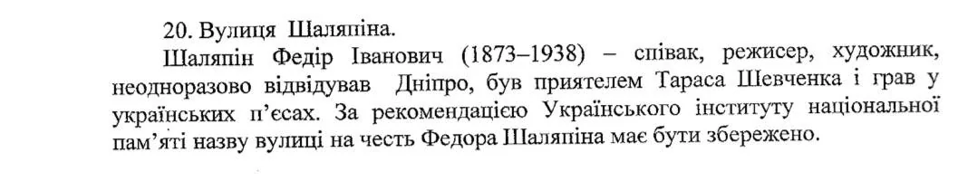 Вивчаючи обґрунтування повернення старих назв, зупинились на вулиці імені Федора Шаляпіна. У документі вказано, що він «був приятелем Тараса Шевченка». Втім, український письменник та художний помер у березні 1861 року, а Федір Шаляпін народився – у лютому 1873 року. Тобто між ними аж 12 років!