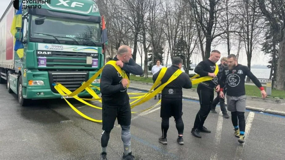 На Січеславській Набережній команда українських стронгменів протягнула 18-тонну фуру на 20 метрів за 16,72 секунди.