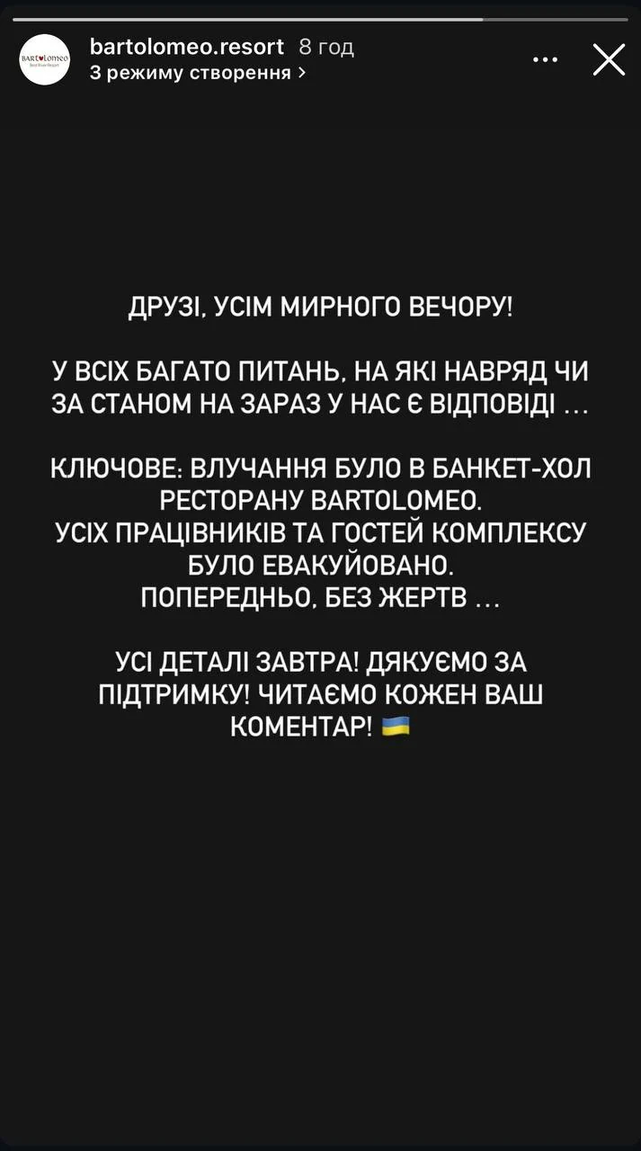 Усіх працівників та гостей комплексу встигли евакуювати. Про це написали на сторінці закладу в інстаграмі.