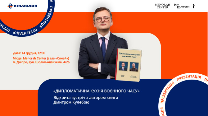 Alina YakovenkoMenorah Center у межах проєкту «Мобілізація інтелектуального потенціалу» запрошує мешканців і гостей міста на відкриту зустріч з українським дипломатом та одним із авторів книги «Дипломатична кухня воєнного часу» – Дмитром Кулебою. Подія відбудеться 14 грудня у залі «Синай». Про це повідомляють у Menorah Center.